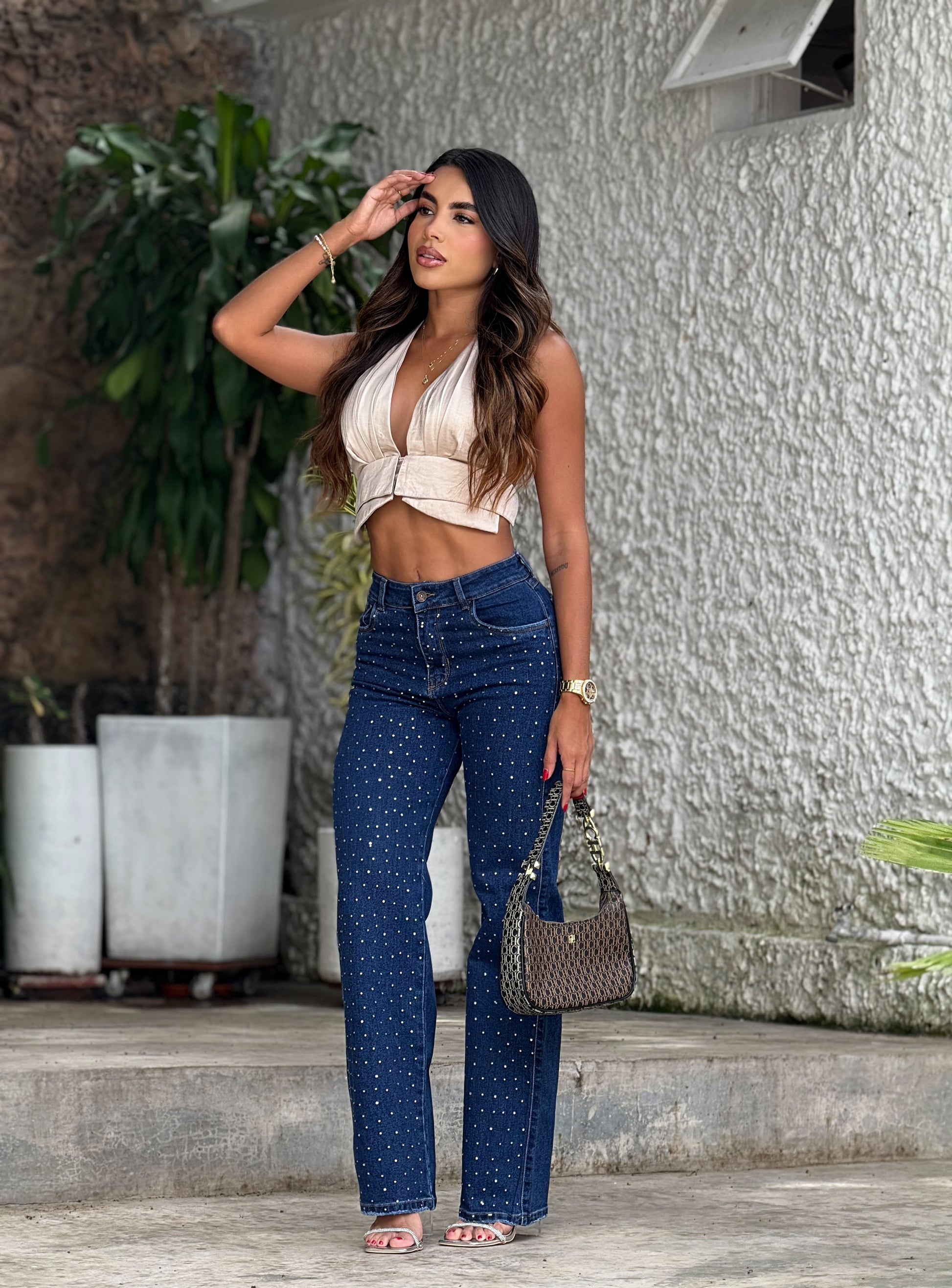 Jean azul oscuro tiro alto con brillos, estilo Wide Leg.